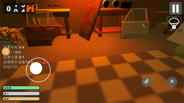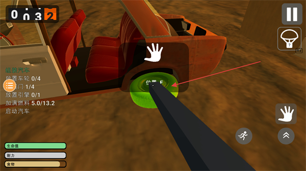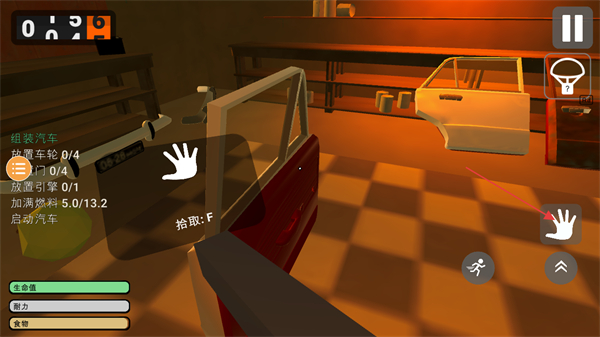 2、點(diǎn)擊右側(cè)抓取按鈕,可以與場景內(nèi)的物品互動,拾取汽車碎片進(jìn)行拼裝。