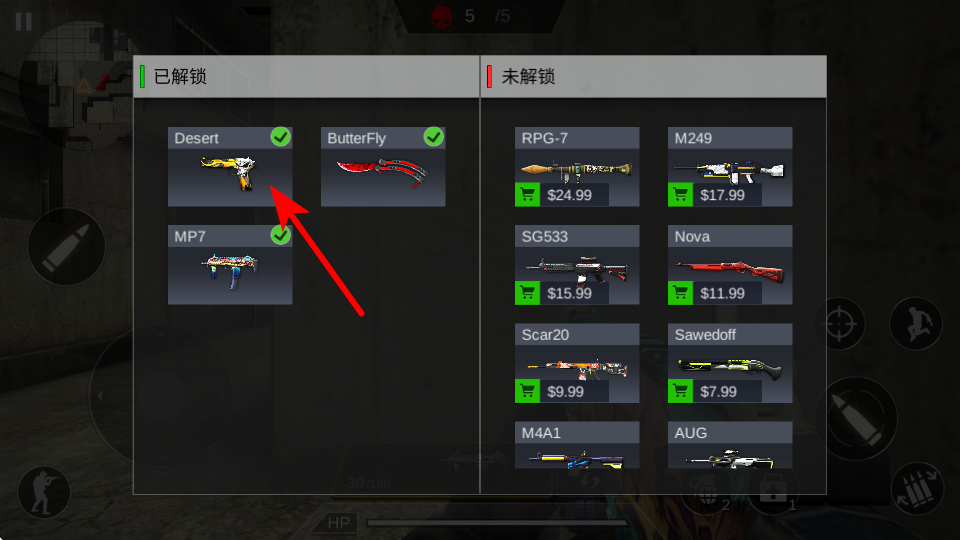 2、界面選擇已解鎖武器如Desert手槍,選擇時(shí)結(jié)合武器火力和適用場(chǎng)景,選用手槍提升靈活性。
