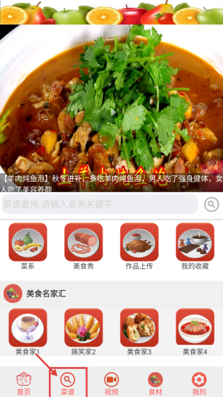 1、打開美食菜譜類應用,點擊底部菜譜選項,進入菜譜大全頁面。