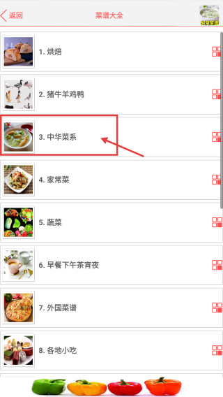 2、在菜譜大全頁面,點擊中華菜系分類,進入中華菜系細分頁面。