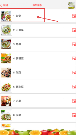 3、在中華菜系頁面,點擊浙菜分類,進入浙菜菜譜列表頁面。
