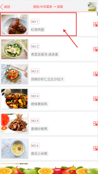 4、在浙菜菜譜列表中,找到紅燒雞翅菜譜條目,點擊查看該菜譜詳情。
