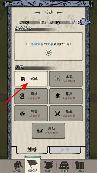 2、在活動界面點擊巡城可參與勢力任務(wù),參與后可獲取金幣、木材、鐵礦等資源,提升城市的經(jīng)濟(jì)和建設(shè)實力。