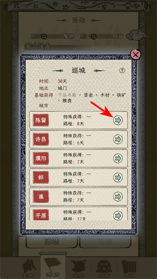3、選擇巡城地點如陳留時,點擊對應(yīng)箭頭可確認(rèn)前往,不同地點的路徑時長和特殊獎勵不同,結(jié)合自身需求選擇。