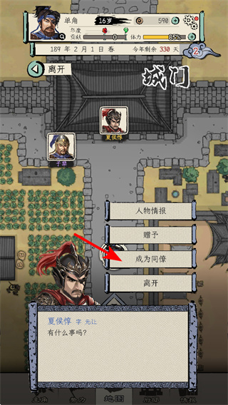4、在城門區(qū)域點擊成為同僚可招募武將如夏侯惇,招募后可增強戰(zhàn)力,助力完成勢力任務(wù)和城市保衛(wèi)戰(zhàn)。