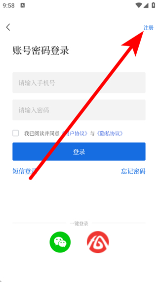 3、在登錄頁面,點(diǎn)擊右上角注冊,進(jìn)入注冊頁面。