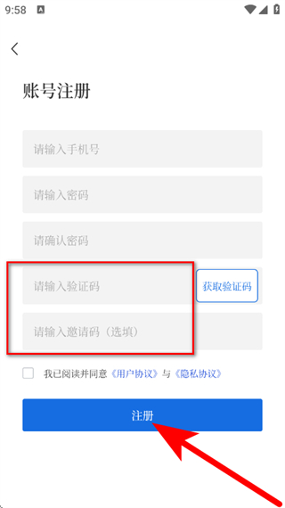 5、輸入驗證碼,勾選已閱讀并同意后,點(diǎn)擊注冊,完成操作。