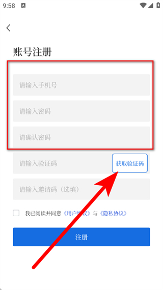 4、輸入手機(jī)號、密碼、確認(rèn)密碼后,點(diǎn)擊獲取驗證碼。