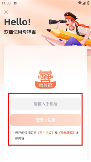 3、在登錄頁面,填寫手機號并勾選協(xié)議后,點擊登錄注冊,進入注冊頁面。