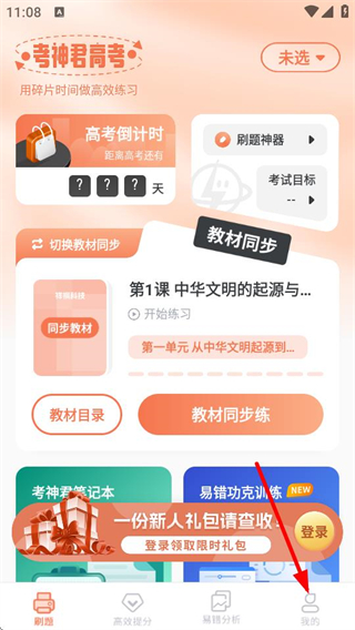 1、在刷題頁面,點擊右下角我的選項,進入個人頁面。