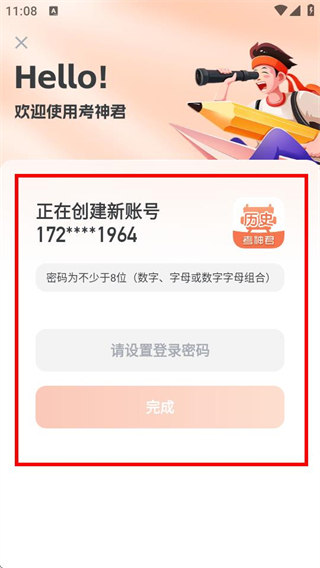 4、在注冊頁面,設(shè)置登錄密碼后點擊完成,即可完成賬號注冊。