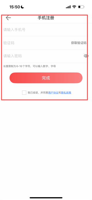 4、在注冊頁面,輸入信息勾選協(xié)議后點擊完成,完成注冊操作。