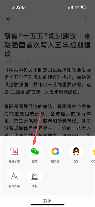 3、在彈出的操作菜單中,選擇微信,即可將該新聞分享至微信。