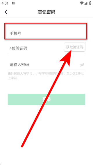 3、在忘記密碼頁面,輸入手機號,點擊獲取驗證碼。