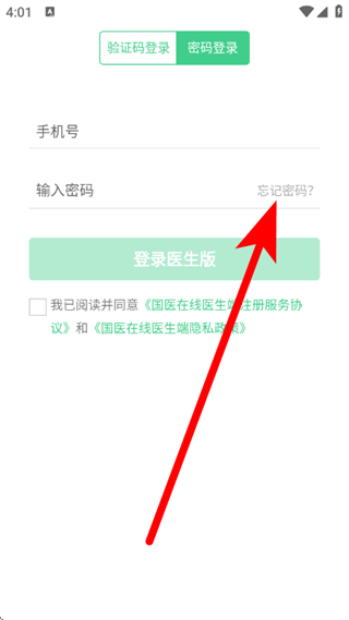 1、打開國醫(yī)在線醫(yī)生端,在登錄頁面,點擊密碼登錄,進入頁面。