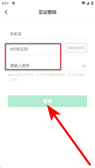 4、輸入驗證碼、新密碼后,點擊登錄,完成密碼重置。
