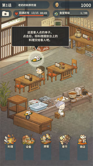 3、點擊客人桌上的單子,再將料理擺放臺的料理交給客人。