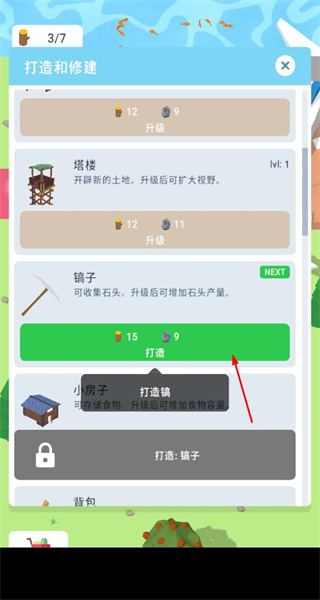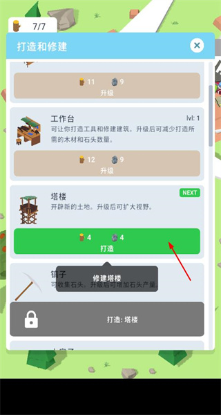 1、在打造界面消耗木材、石頭等資源,打造并升級(jí)工作臺(tái)、塔樓、鎬子等建筑設(shè)施,減少打造資源消耗、擴(kuò)大視野或增加資源產(chǎn)量。