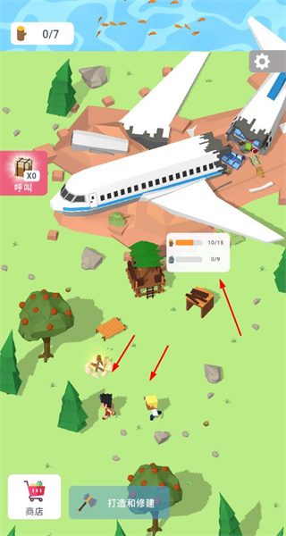2、在飛機(jī)殘骸等場(chǎng)景中收集木材、石頭等資源,同時(shí)利用場(chǎng)景中的樹木、蘋果等獲取物資,為建筑打造和升級(jí)提供資源支持。