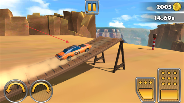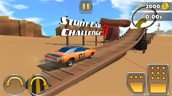 1、操控賽車在沙漠特技賽道行駛,利用右側(cè)按鍵控制賽車加速、特技動(dòng)作,沖上坡道收集金幣。