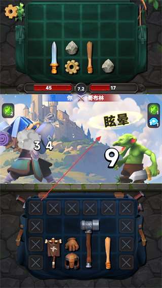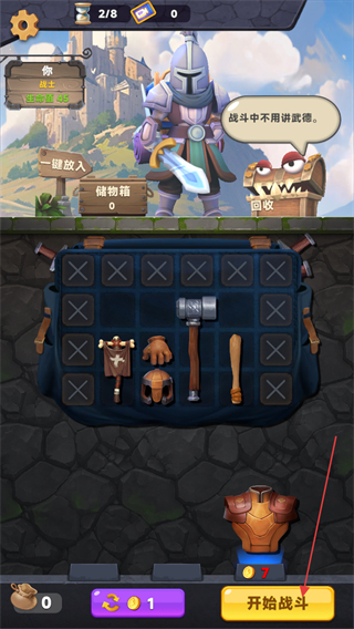 1、整理背包中的武器、防具等物品,點(diǎn)擊開始戰(zhàn)斗按鈕,與哥布林等怪物對(duì)戰(zhàn)。