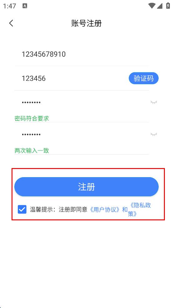 4、勾選注冊即同意相關協(xié)議和政策,點擊注冊,即可完成e會學的賬號注冊。