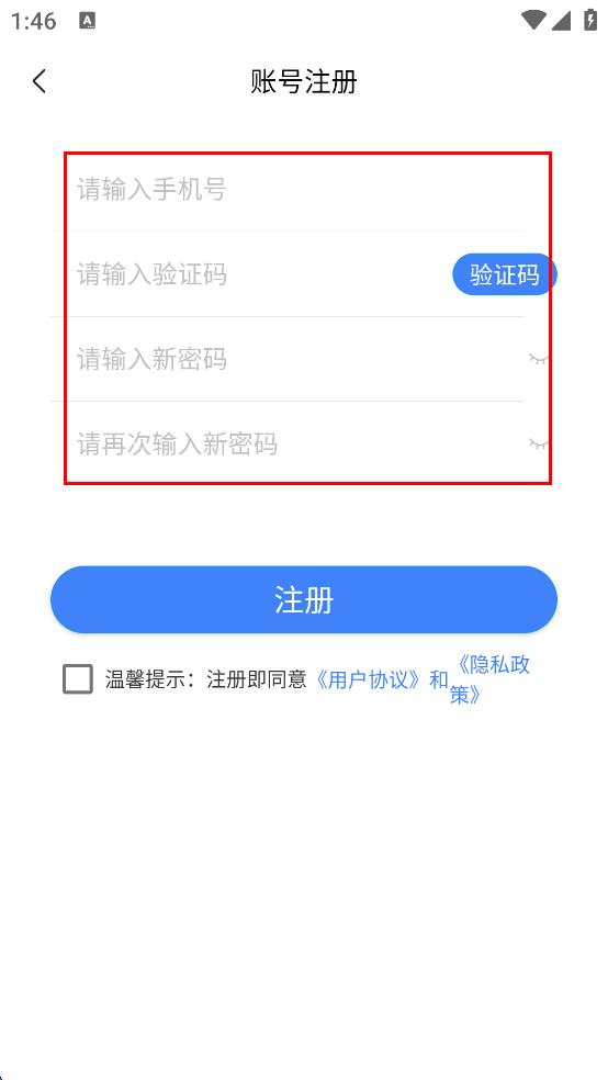 3、在賬號注冊頁面,輸入手機號,點擊獲取驗證碼,輸入驗證碼,再設置并確認新密碼。