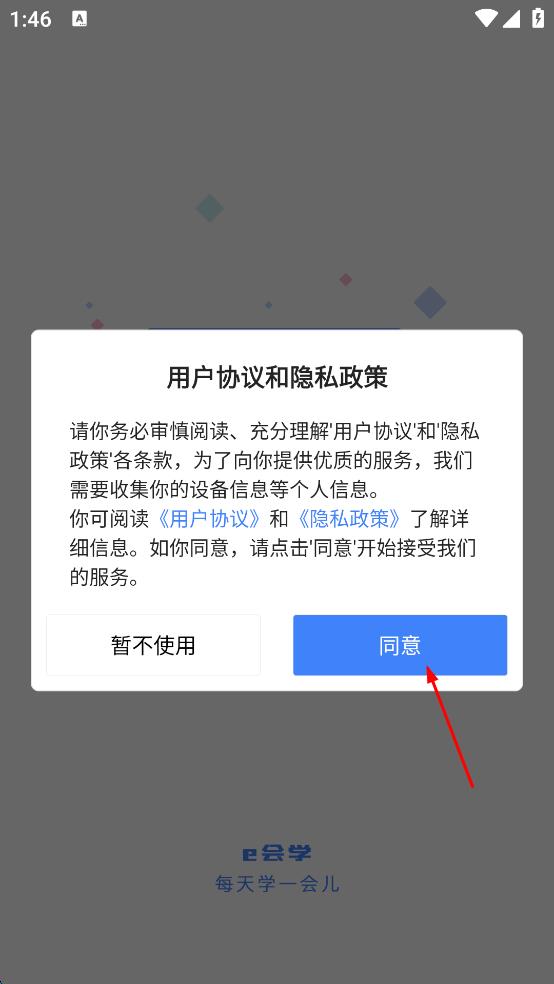 1、打開e會學,在彈出的用戶協(xié)議和隱私政策頁面,點擊同意,進入賬號登錄頁面。