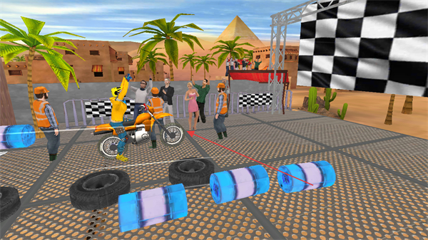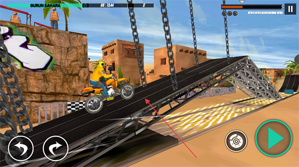 1、點(diǎn)擊開始按鈕,駕駛摩托車在沙漠特技賽道行駛,利用左右轉(zhuǎn)向按鈕控制方向,沖過起點(diǎn)。