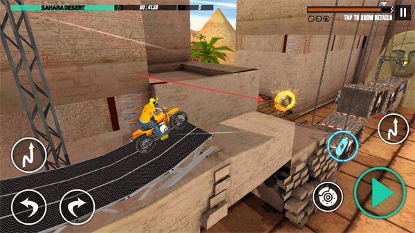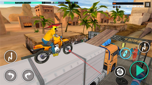1、駕駛摩托車(chē)在沙漠場(chǎng)景的復(fù)雜賽道行駛,利用左右轉(zhuǎn)向和加速按鈕,在卡車(chē)、建筑間穿梭,挑戰(zhàn)高難度地形。