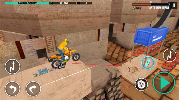 2、駕駛摩托車(chē)飛躍建筑間隙,在空中保持平衡,積累空中時(shí)間,完成特技動(dòng)作獲取高分。