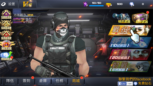 1、打開雷霆槍戰(zhàn)游戲主頁,點擊右側(cè)戰(zhàn)役按鈕進入游戲。