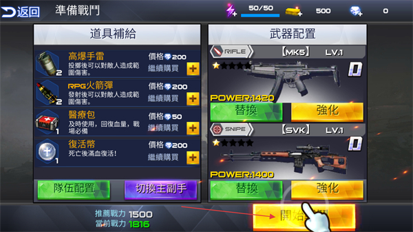 2、戰(zhàn)斗準備界面可以選擇購買道具補給,或是選擇強化武器,完成所有準備工作后點擊下方開始戰(zhàn)斗按鍵進入戰(zhàn)斗。