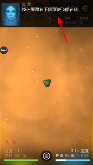 1、操控飛船時(shí),按住屏幕右下側(cè)可使飛船右轉(zhuǎn),這是調(diào)整飛船方向的關(guān)鍵操作,準(zhǔn)確操作能讓飛船在太空靈活轉(zhuǎn)向。
