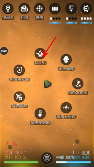 2、在功能界面中,點(diǎn)擊戰(zhàn)斗機(jī)選項(xiàng),可啟用戰(zhàn)斗機(jī)功能,助力飛船在太空戰(zhàn)斗中提升戰(zhàn)力,是應(yīng)對(duì)太空威脅手段。