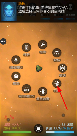 3、點(diǎn)擊目標(biāo)按鈕,可進(jìn)入目標(biāo)選擇界面,能選擇行星和空間站作為航行目標(biāo),這是規(guī)劃太空航行路線的關(guān)鍵操作。