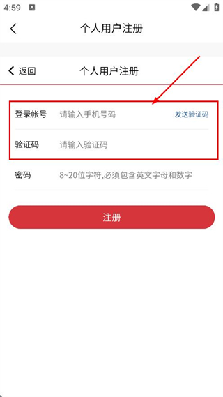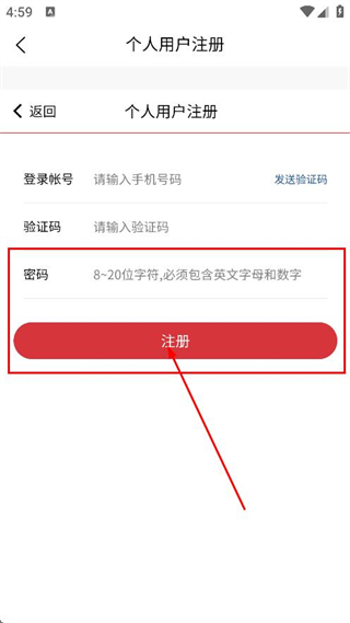 5、設(shè)置8-20位、必須包含英文字母和數(shù)字的密碼后,點(diǎn)擊注冊,完成個(gè)人用戶注冊操作。