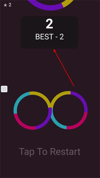 4、游戲結(jié)束界面顯示當(dāng)前得分2和最佳-2,下方有重新開始提示,點擊屏幕重新開始游戲。