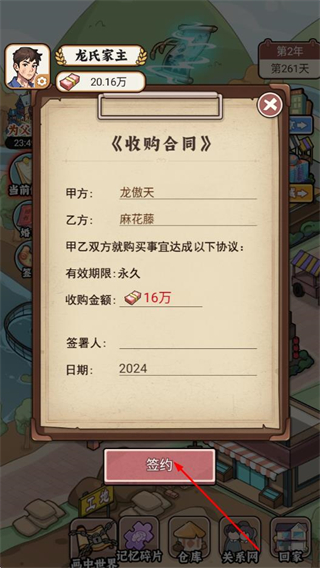 3、在收購(gòu)合同界面點(diǎn)擊簽約,完成收購(gòu),快速擴(kuò)張商業(yè)版圖,提升龍氏家族的勢(shì)力。