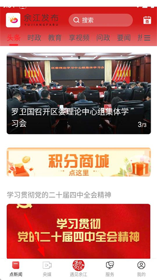 1、在余江發(fā)布首頁(yè),點(diǎn)擊底部導(dǎo)航欄的央媒選項(xiàng),可進(jìn)入央媒內(nèi)容頁(yè)面。