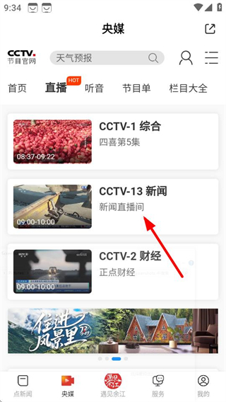 2、進(jìn)入央媒頁(yè)面后,點(diǎn)擊CCTV-13新聞對(duì)應(yīng)的直播條目,可進(jìn)入該頻道的直播界面。