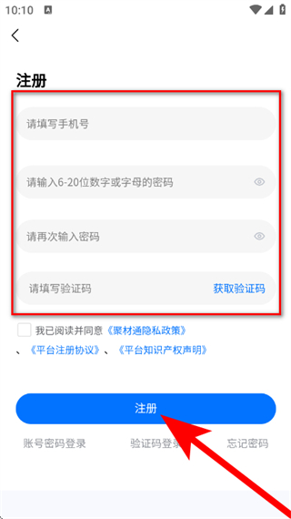 4、在注冊頁面,填寫手機號等信息,獲取并填寫驗證碼,勾選協(xié)議后,點擊注冊,完成賬號注冊。