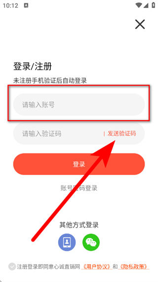 3、在登錄注冊頁面,輸入賬號或手機(jī)號,點(diǎn)擊發(fā)送驗(yàn)證碼。