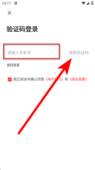 3、在驗證碼登錄頁面,輸入手機號,勾選同意后,點擊獲取驗證碼。