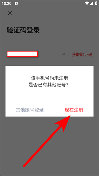 4、在彈出的該手機號尚未注冊提示框中,點擊現(xiàn)在注冊。