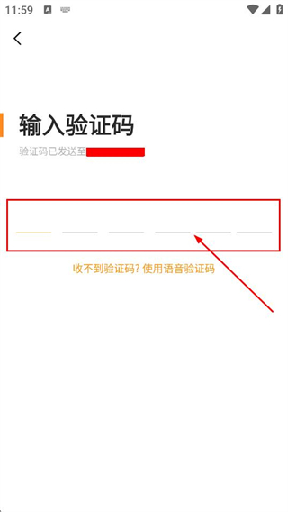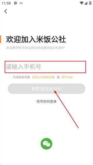 4、在驗(yàn)證碼輸入界面,輸入收到的驗(yàn)證碼,完成米飯公社的登錄操作。