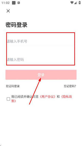 3、在密碼登錄頁面填寫手機(jī)號(hào)和密碼,勾選協(xié)議后,點(diǎn)擊登錄完成賬號(hào)登錄操作。