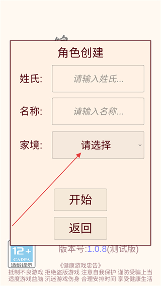 2、首先需要進(jìn)行角色的創(chuàng)建,輸入姓氏名稱和家境的選擇,點(diǎn)擊下方開始進(jìn)入劇情。
