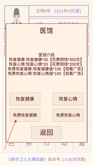 4、隨著月份的增長,角色的健康值也會有所變化,點(diǎn)擊醫(yī)館可以恢復(fù)健康值和心情度。