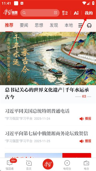 1、在學(xué)習(xí)強(qiáng)國(guó)首頁(yè)點(diǎn)擊右上角我的,進(jìn)入我的頁(yè)面。